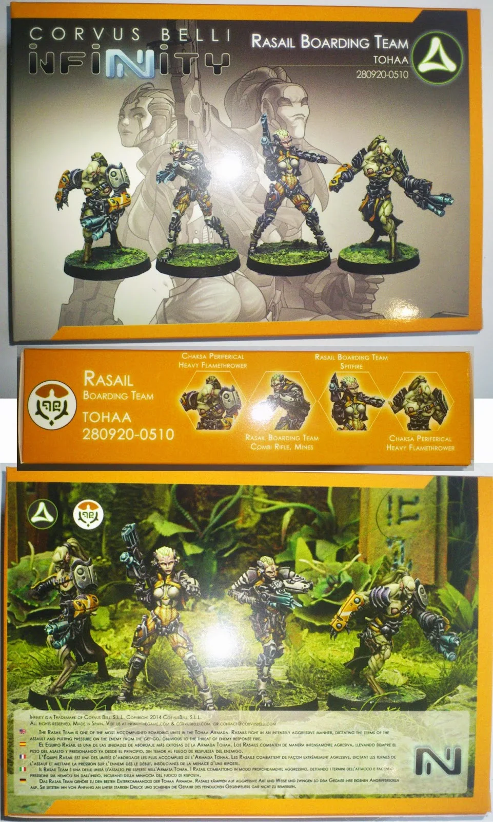A banda de esto, las cajas continúan constando de una caja de cartulina satinada exterior impresa a todo color según los patrones anteriormente comentados que nos muestran la miniatura en su máximo esplendor, mostrando en el frontal una imagen de la misma acompañada del logo de Infinity, así como el símbolo y unos breves datos de la facción a la que pertenece.