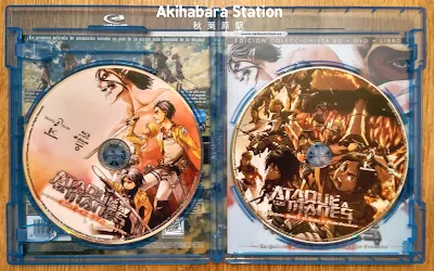 Si abrimos los estuches encontramos como decíamos ambos discos, estando impresos los DVD con los pósters que nos muestran los estuches de cartulina, mientras los discos Blu-ray nos traen impresos los pósters que diseño para los films el propio Hajime Isayama.