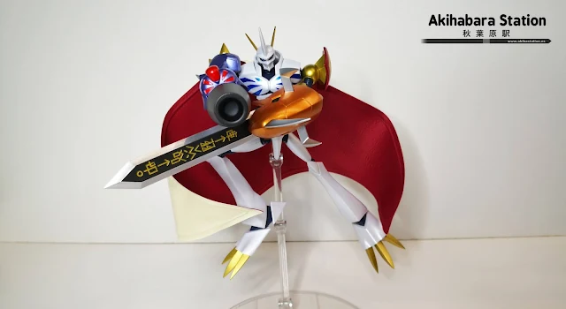 Otro cambio significativo se encuentra en la capa de Omegamon. Originalmente estaba hecha de tela y sin forro, pero en este caso cuenta con diferentes materiales que le dan un aspecto mas modelable, así como un alambre interior que al proporcionarle peso y estabilidad permite poder moverla al posar a la figura.